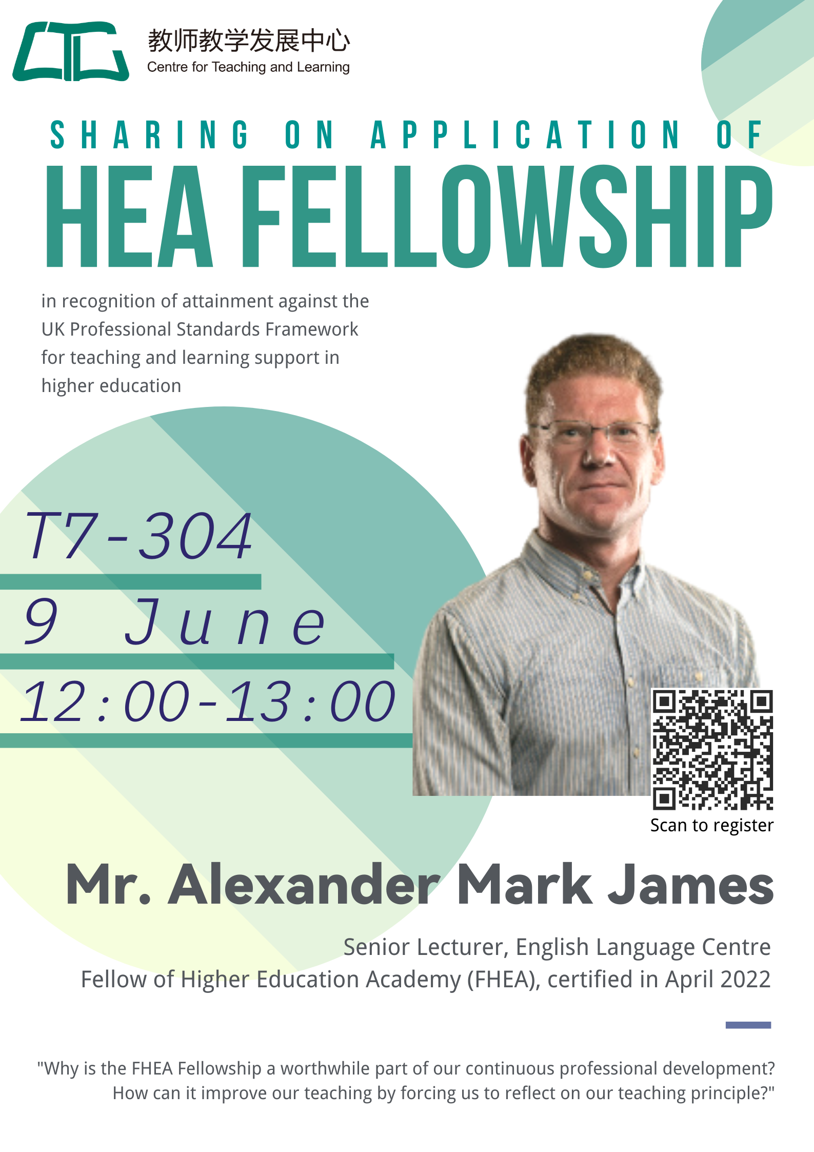 Abstract: In this informal sharing session, Mr. James will describe why the FHEA Fellowship is a worthwhile part of continuous professional development. Specifically, He will describe how it can improve teaching and how his recent experience of achieving Fellowship status.