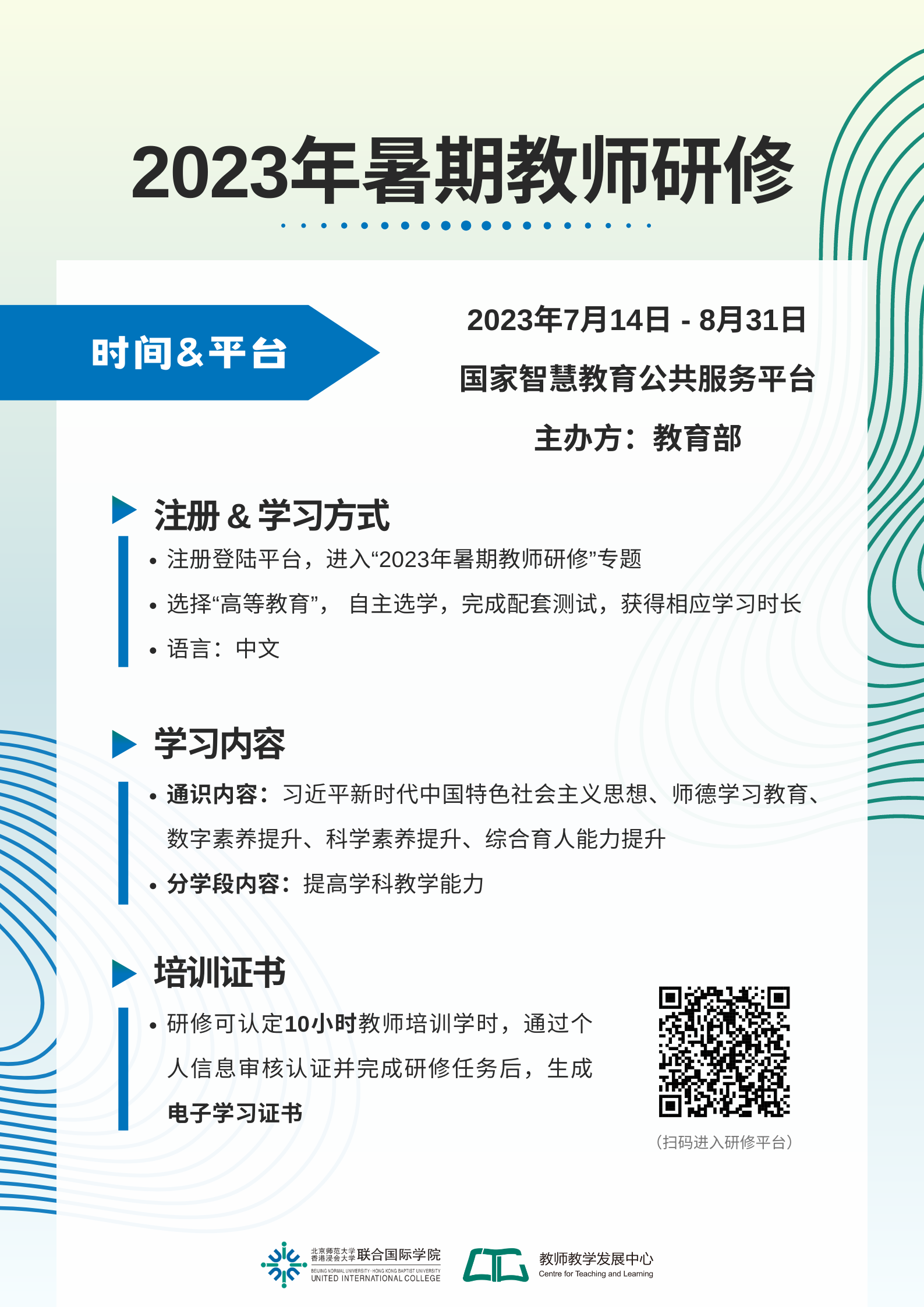即日起至8月31日,进入国家智慧教育公共服务平台(www.smartedu.cn), 注册登录后,点击“2023暑期教师研修”专题,选择“高等教育”,自主选学并完成配套测试,获得相应学习时长。