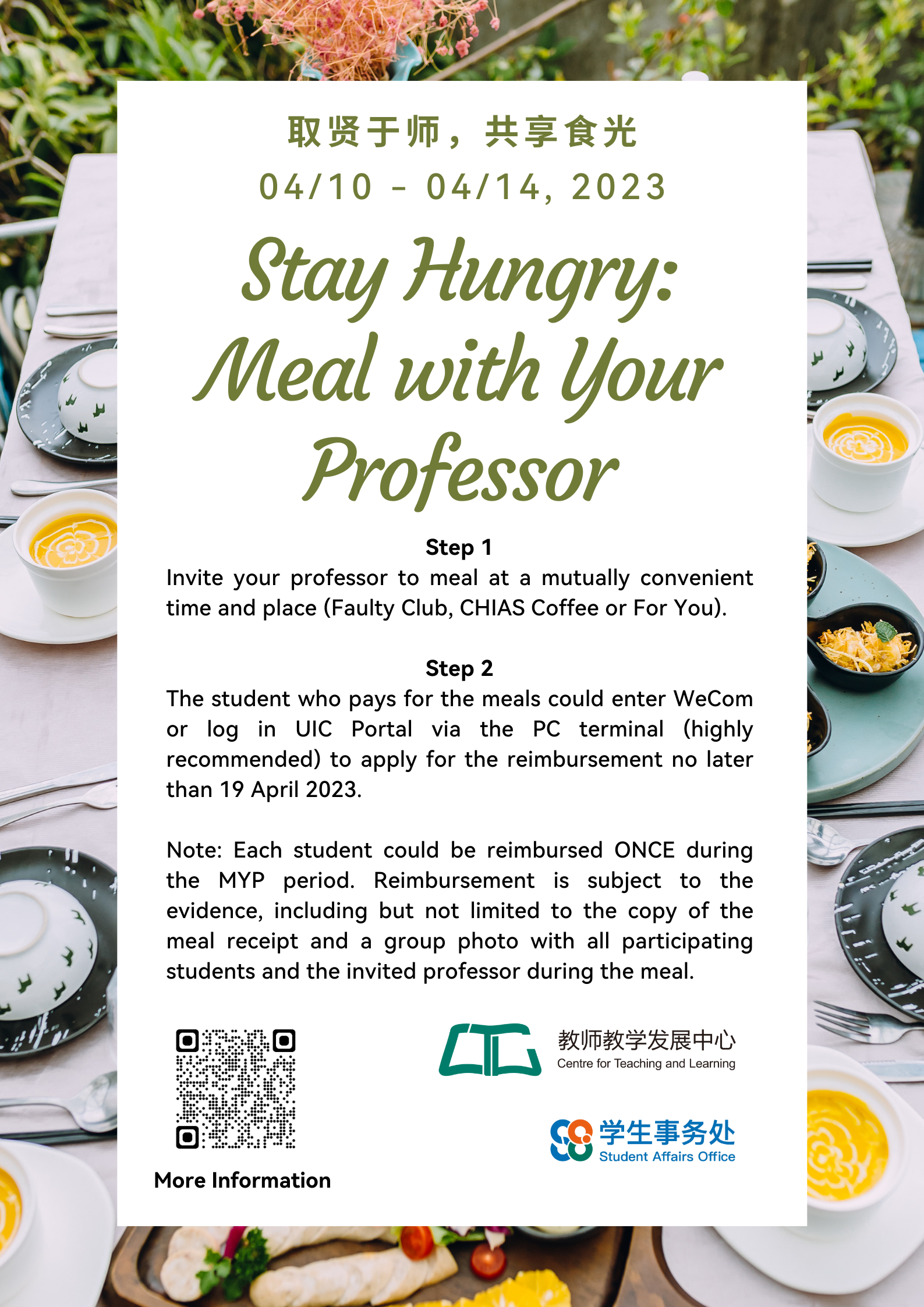 2. CTL will reimburse the meal expenses (A maximum of RMB 50 per person per gathering) for the student who pays for the meals. The reimbursement is subject to the evidence, including but not limited to the copy of the meal receipt and a group photo with all participating students and the invited professor during the meal. Each student could be reimbursed ONCE during the MYP period. Only meal payment for the MYP program occurred between 10-14 April 2023 will be accepted and processed.