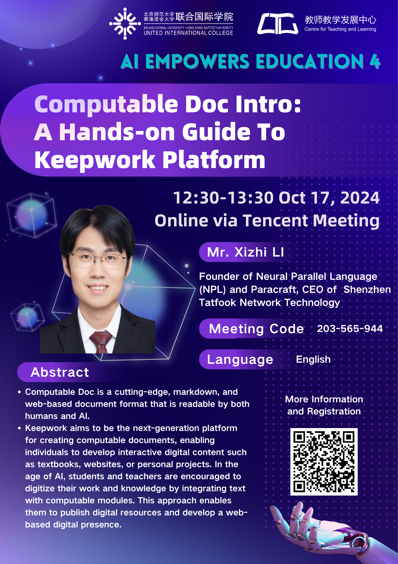 Facilitator: Mr. Xizhi LI (Founder of Neural Parallel Language (NPL) and Paracraft, CEO of Shenzhen Tatfook Network Technology)