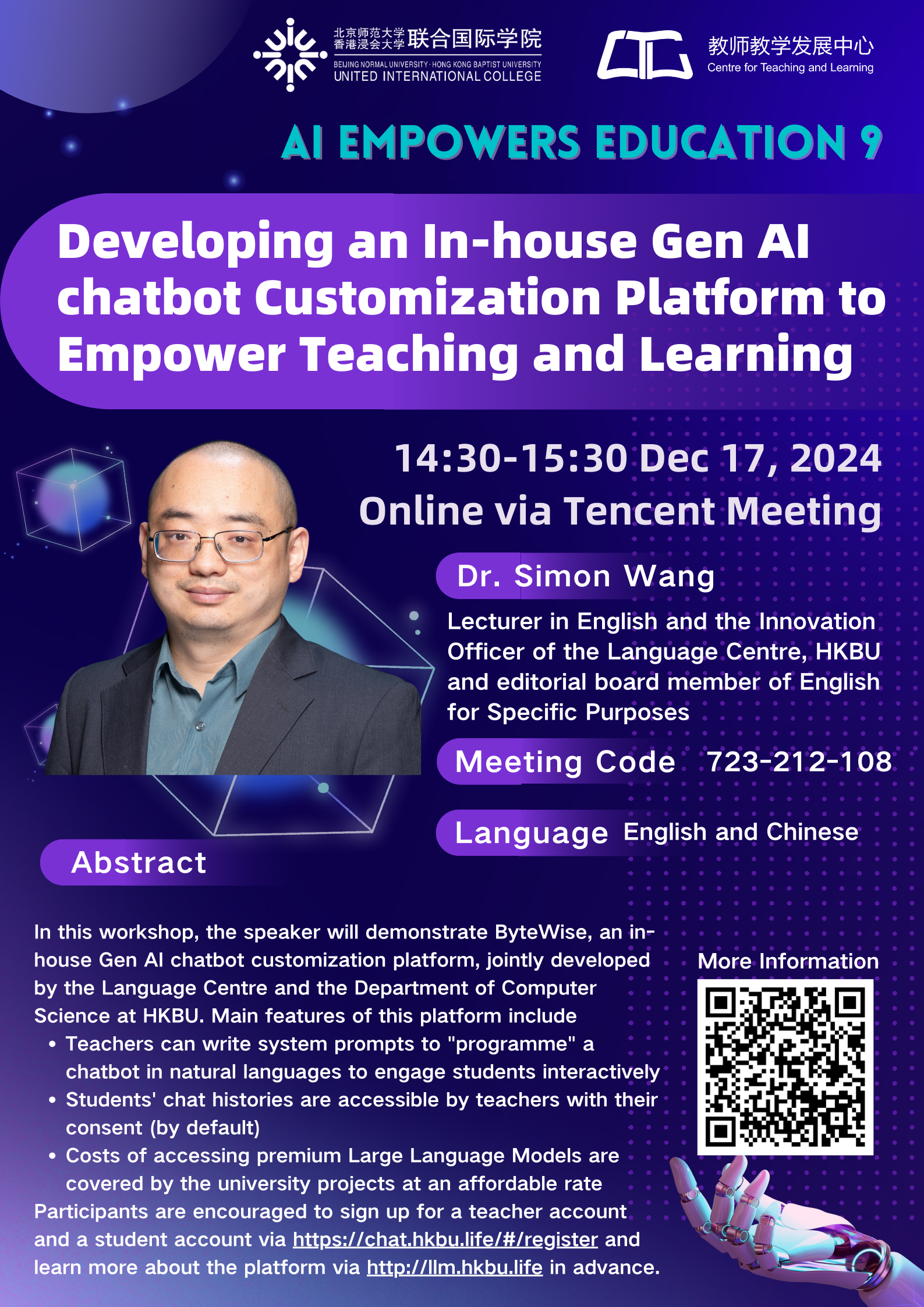 In this workshop, the speaker will demonstrate ByteWise, an in-house Gen AI chatbot customization platform, jointly developed by the Language Centre and the Department of Computer Science at HKBU. Main features of this platform include