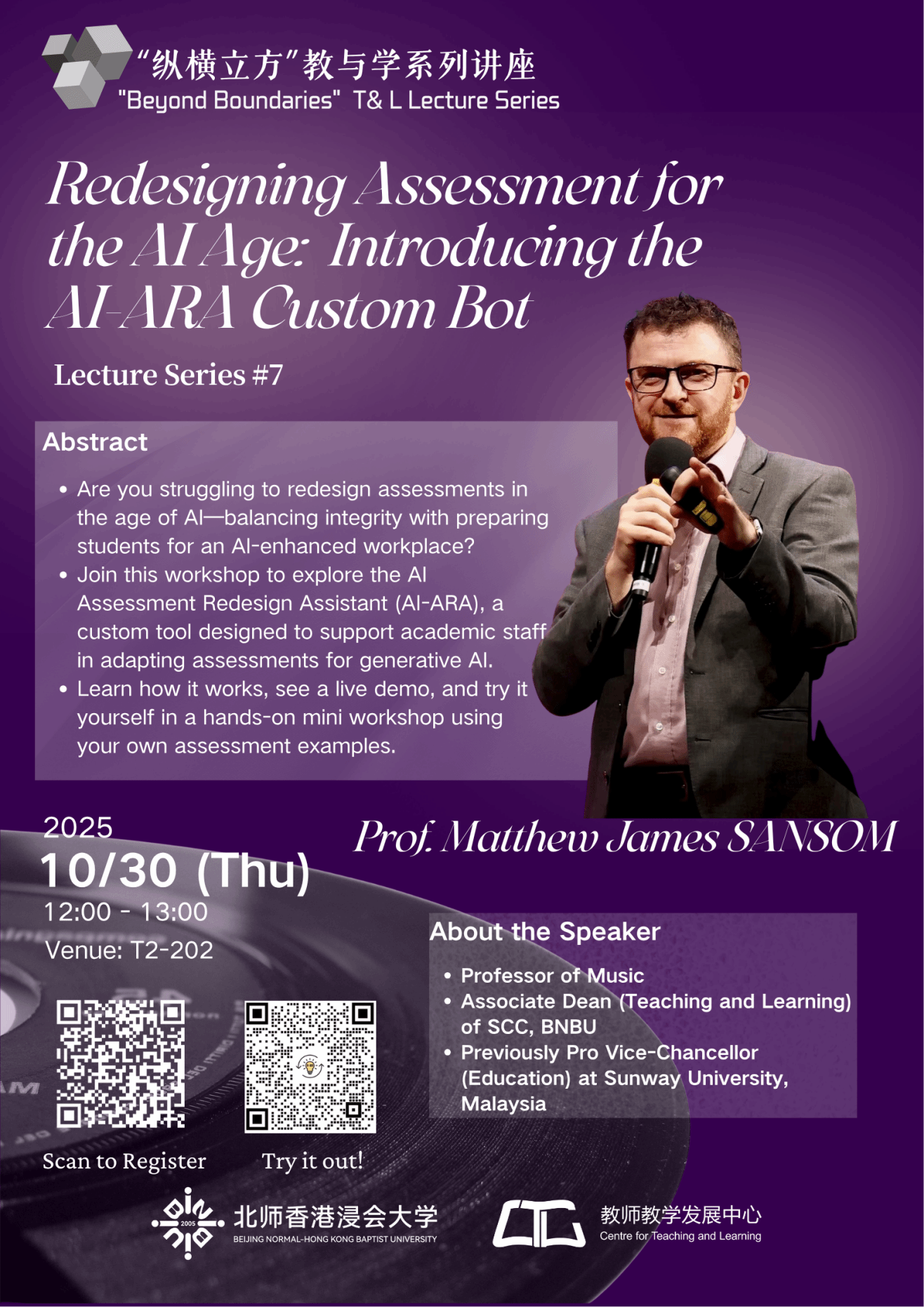 About the Speaker: Matthew Sansom is a Professor of Music at Beijing Normal-Hong Kong Baptist University with over 25 years of academic leadership experience. Previously Pro Vice-Chancellor (Education) at Sunway University, Malaysia, he has held senior positions at multiple universities internationally. Alongside his academic career, he maintains an active artistic practice in sound art, installation, and composition, with commissioned works exhibited and performed globally. He has been actively exploring AI's impact on education since the launch of ChatGPT and is guest editor of the 'AI and Education' special edition of BNBU's Innovative Teaching and Learning Journal expected in 2026.