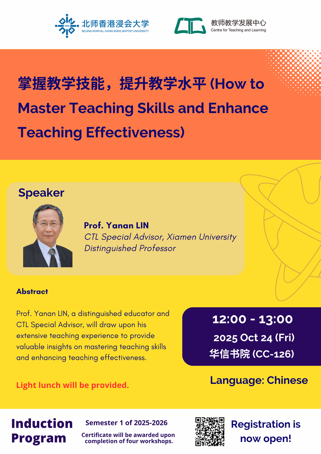 Abstract: Prof. Yanan LIN, a distinguished educator and CTL Special Advisor, will draw upon his extensive teaching experience to provide valuable insights on mastering teaching skills and enhancing teaching effectiveness.