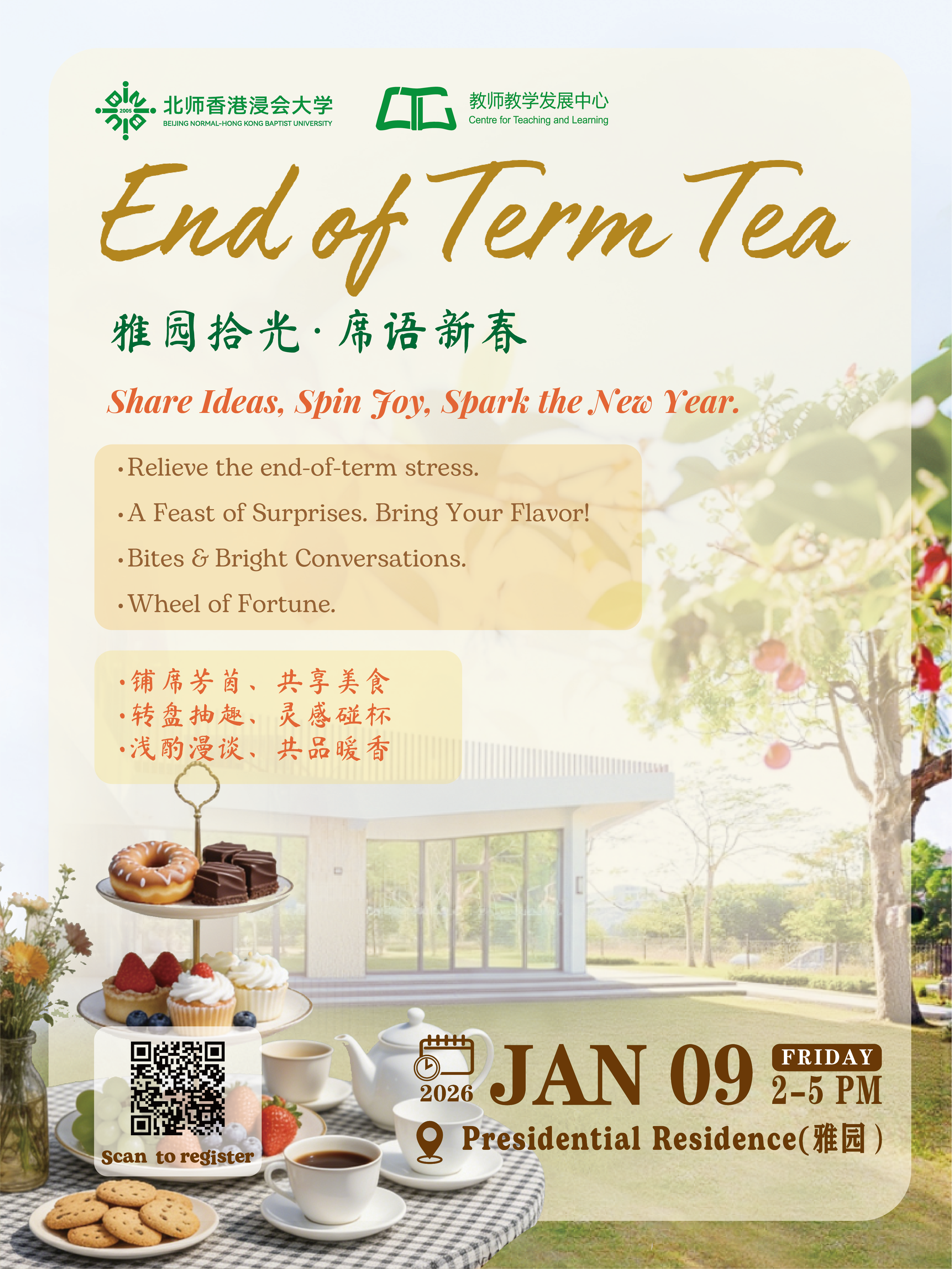 As the semester draws to a successful close and we welcome the fresh beginnings of the new year, we cordially invite you to a relaxed and joyful End of Term Tea Gathering (雅园拾光·席语新春). We will share delicious afternoon tea & cakes, light bites, and easy conversation in a lovely picnic-like atmosphere. You are also welcome to bring a dish or snack to contribute to our potluck-style sharing - a true “feast of surprises” from our diverse community.