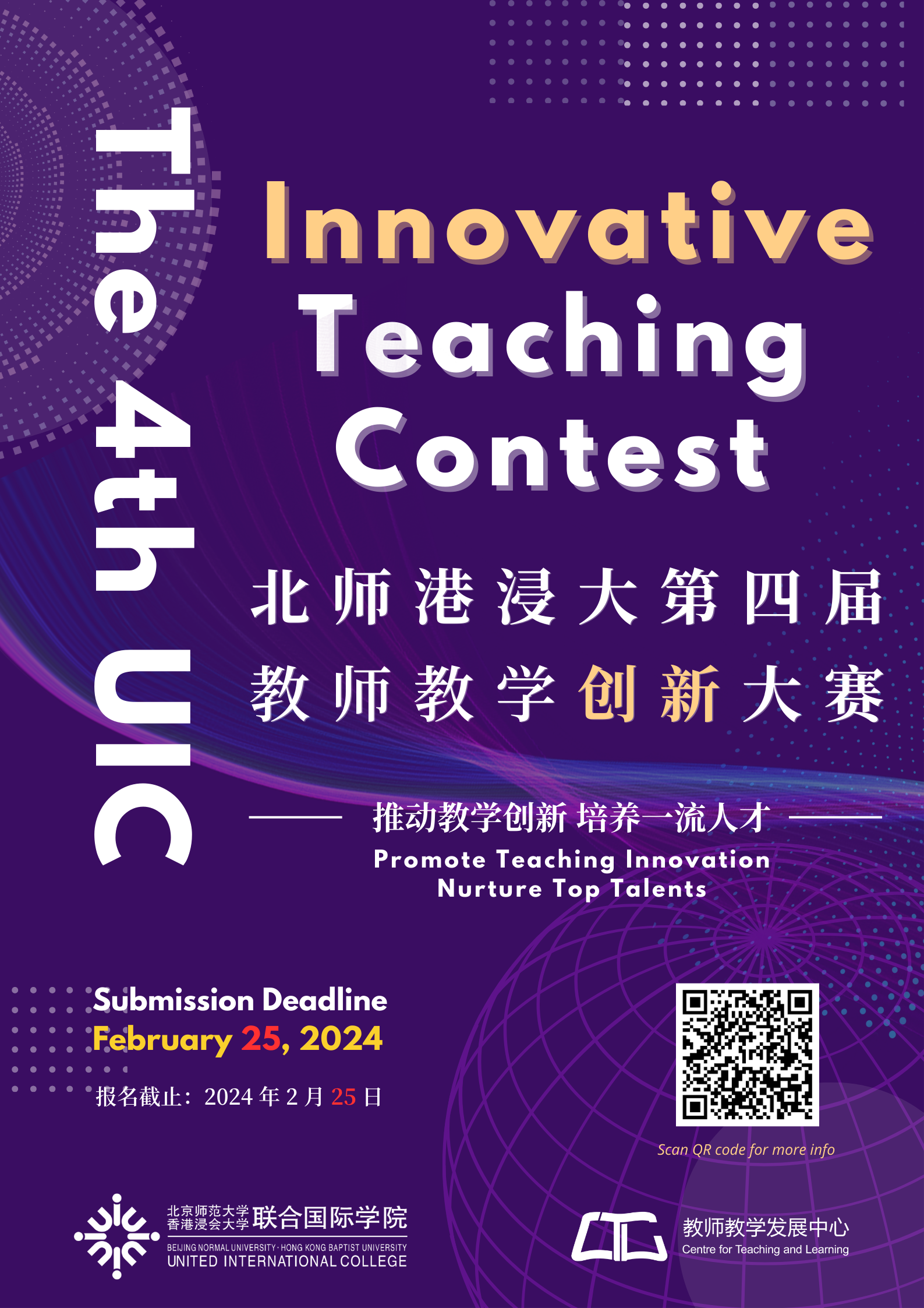 In order to promote teaching excellence at UIC and nominate outstanding teachers for the 4th National and Guangdong Innovative Teaching Contest (第四届全国高校教师教学创新大赛广东分赛暨广东省高校教师教学创新大赛), we are pleased to announce that the 4th BNU-HKBU United International College Innovative Teaching Contest is scheduled to commence from now to late February 2024 (see attachment 1).