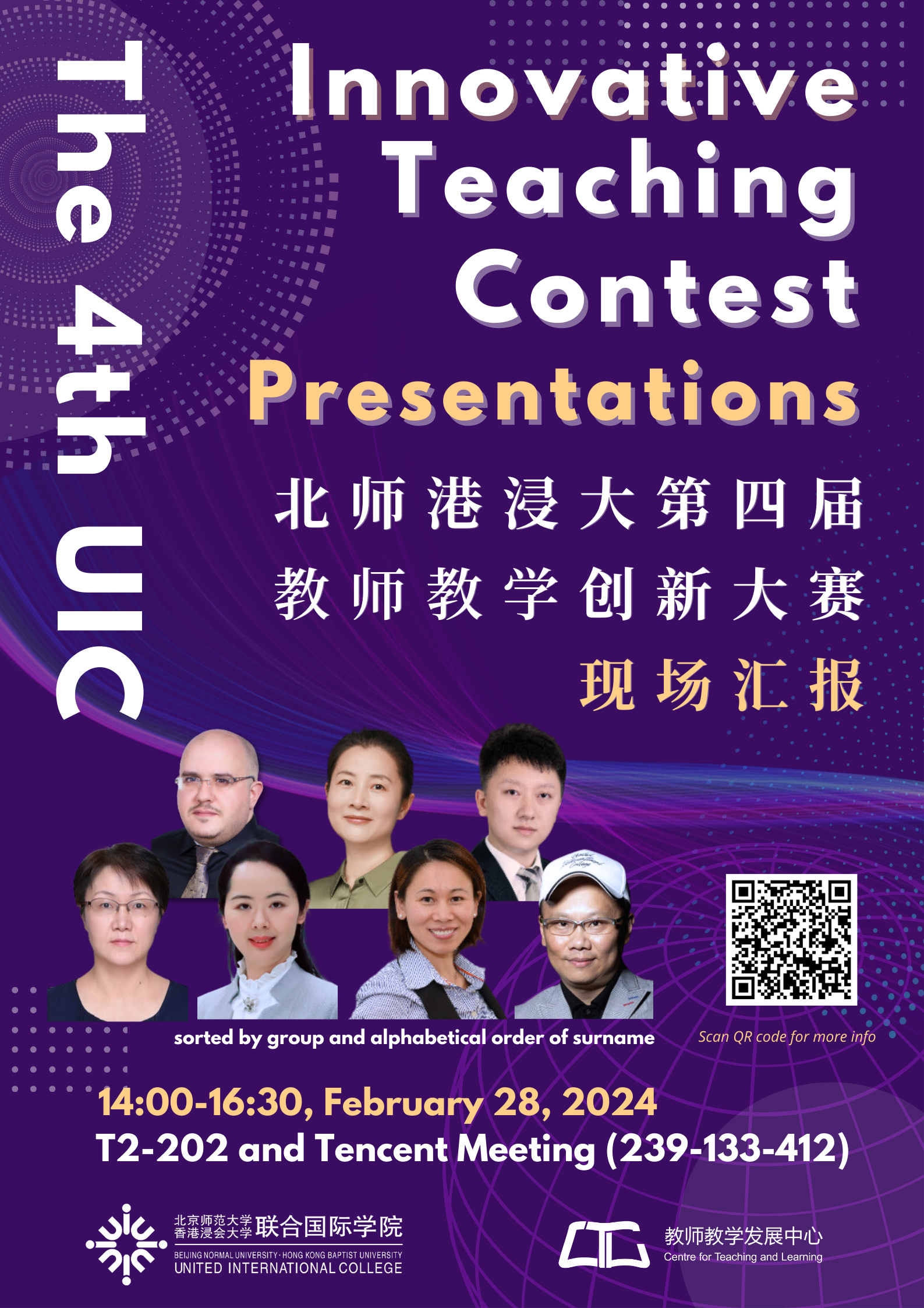 In order to promote teaching excellence at UIC, we launched the 4th UIC Innovative Teaching Contest. All participants will present their outstanding teaching practices this Wednesday (Feb 28). Detailed information is as follows: