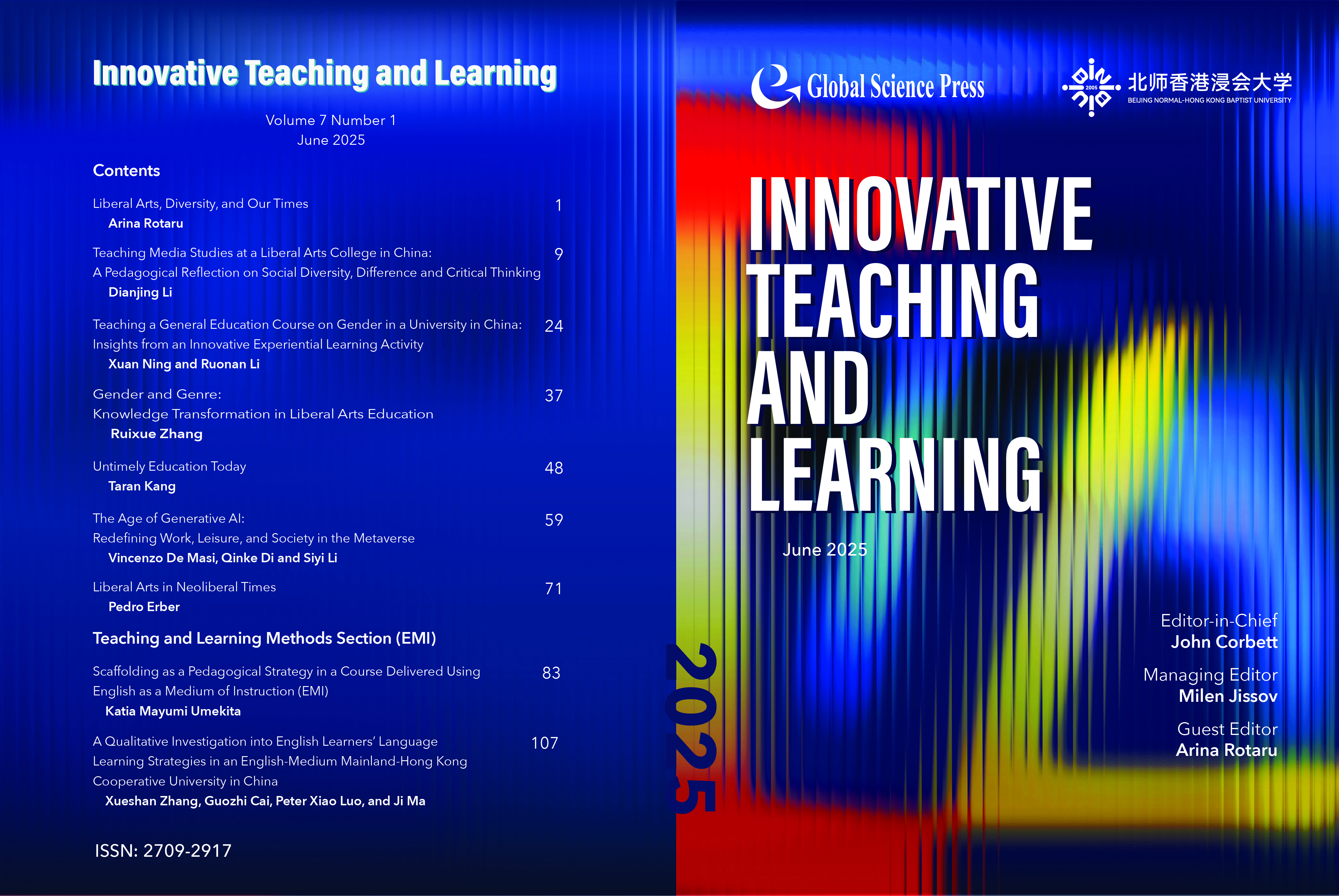 Innovative Teaching and Learning (ISSN 2709-2917 print; ISSN 2709-2291 online), a scholarly journal established by Beijing Normal-Hong Kong Baptist University (BNBU), advances pedagogical excellence through disseminating empirical research, critical review studies, and evidence-based teaching practices.