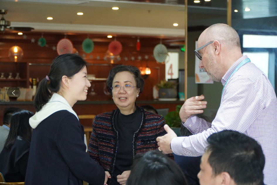 Prof. Stella CHO (Associate Vice President (Student Development), Acting Dean of School of General Education) chatting with new staff
