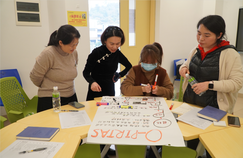 在工作坊中,郭教授简要回顾了O-PIRTAS教学法,并带领参与教师以O-PIRTAS翻转教学法的框架为基础,进行翻转课堂教学设计的实操。老师们以学院为小组,开展各自相关主题的翻转课堂教学设计。通过郭教授的悉心指点以及各小组的交流互评,老师们对于O-PIRTAS框架下教学目标的设置、大纲的设计、教学视频的使用、课堂准备工作和翻转课堂的通用模式等有了更深刻的理解,更好地汲取翻转课堂与混合式教学的创新路径。