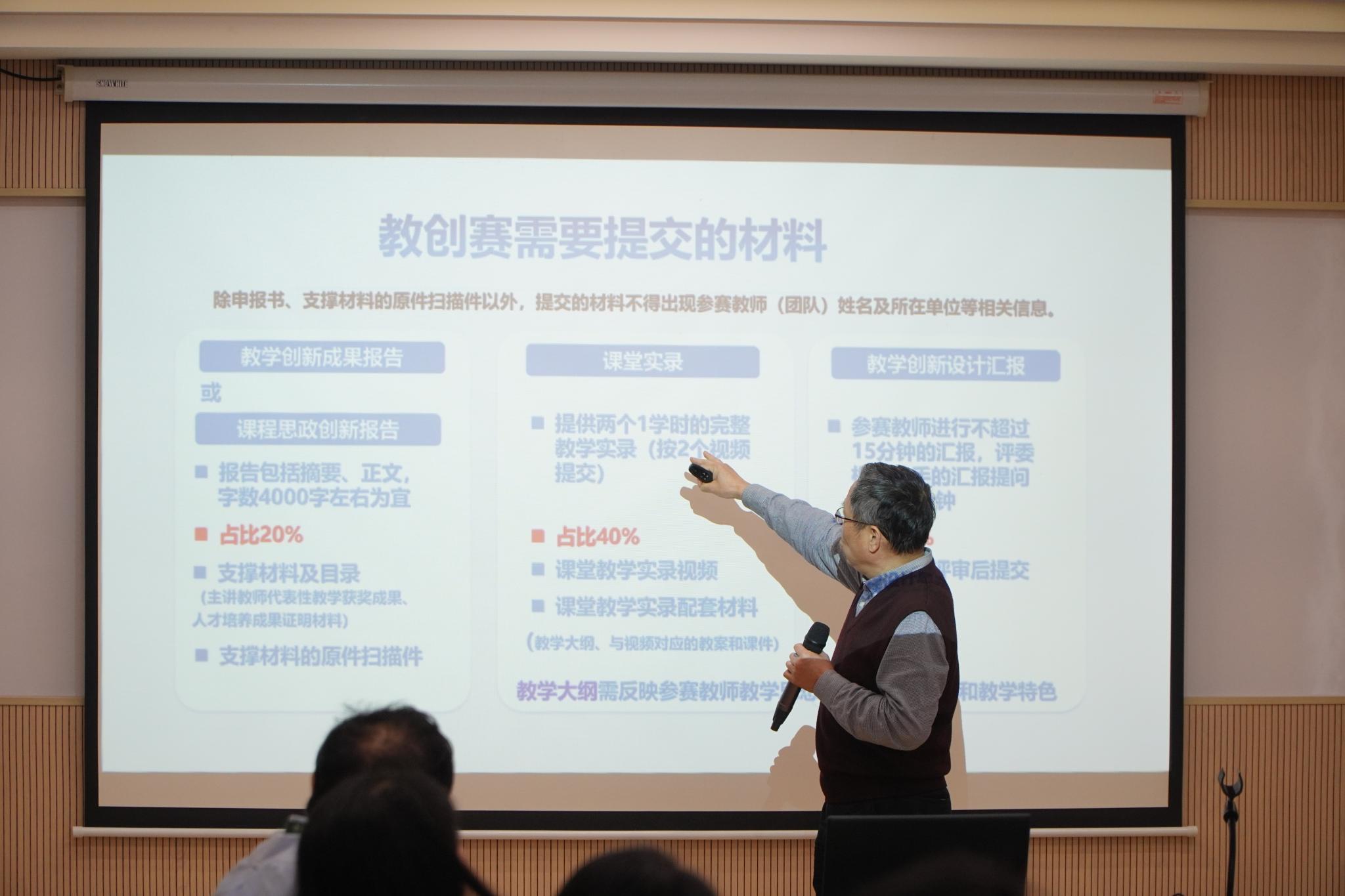 林亚南教授对第四届高校教师教学创新大赛基本情况进行了说明。首先分析了本次第四届教学创新大赛助推“四新”建设,与课程思政同向同行的目标,梳理了教学创新的大赛的整体流程,并从申报书与教学创新成果报告的撰写和课堂实录设计、拍摄的注意事项等方面入手,深入剖析了第四届教学创新大赛在材料提交阶段的要求,最后介绍了教学设计汇报的评分标准,让各位老师从评审的角度更好地理解现场汇报的展示要点。