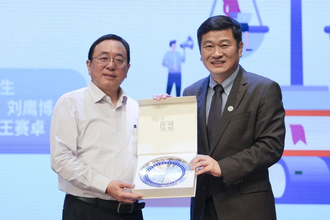 北师港浸大校长陈致教授(右)向倪明选教授致送纪念品