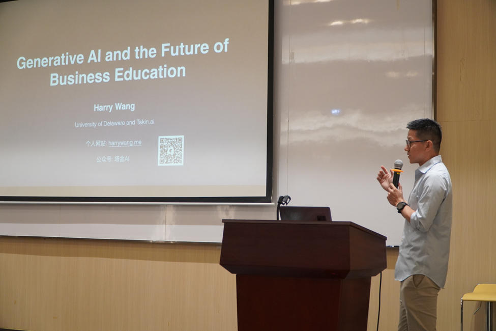 The fifth session of the AI Empowers Education workshop series took place in T2-102 on October 25, 2024. Hosted by the Associate Director of CTL, Dr. Milen Jissov, and led by Prof. Harry Jiannan Wang—a Professor of Management Information Systems at the University of Delaware and the founder and CEO of Takin.AI—this session explored the potential future of business education through generative AI. The workshop featured practical teaching applications and entrepreneurial case analyses, attracting over 60 engaged participants.