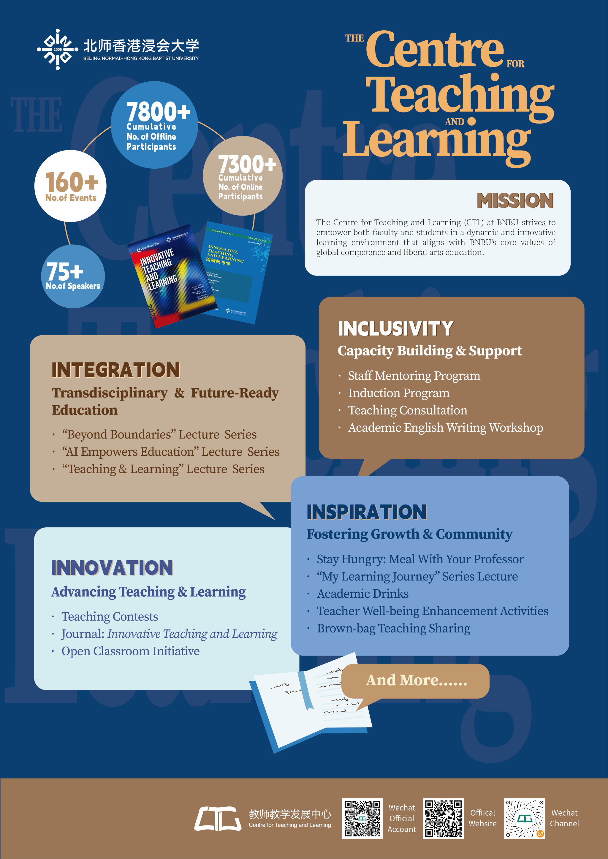 Established in January 2021 with the mission of promoting excellence in teaching and learning, BNBU’s CTL gain the endorsement in the same year for its Higher Education Teaching Quality and Reform Project of Guangdong Province for undergraduate universities. Since its inception, the centre has organized over 160 professional development activities covering themes such as AI-empowered education, transdisciplinary education, and teaching skills enhancement, reaching more than 15,000 participants online and offline. Through activities such as Induction Program, Open Classroom Initiative, Staff Mentoring Program, and Teaching Consultation Program, CTL provides a systematic growth path for teachers—from conceptual understanding to practical application—fostering transdisciplinary integration and innovation in educational models. Additionally, leveraging the advantages of the collaborative partnership between Mainland China and Hong Kong universities, the centre has built cross-university and cross-cultural exchange platforms, facilitating the two-way flow of high-quality teaching resources and successful experiences. This not only enhances teachers’ international pedagogical perspectives but also creates a rich and diverse learning environment for students.