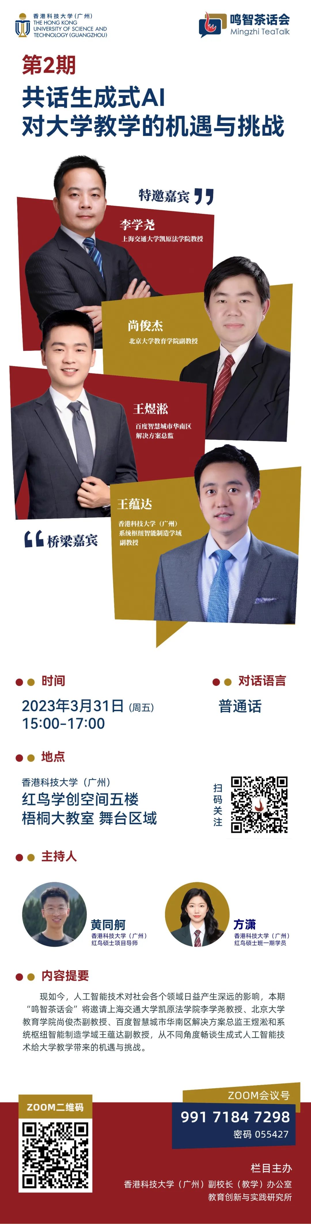 | Mingzhi TeaTalk | Discussion on the Opportunities and Challenges of Generative AI for University Teaching Organizer: The Hong Kong University of Science and Technology (Guangzhou) Date &Time: March 31 (Fri), 2023, 15:00 pm – 17:00 pm Language: Mandarin Venue:Via Zoom (room number: 99171847298, password: 055427)