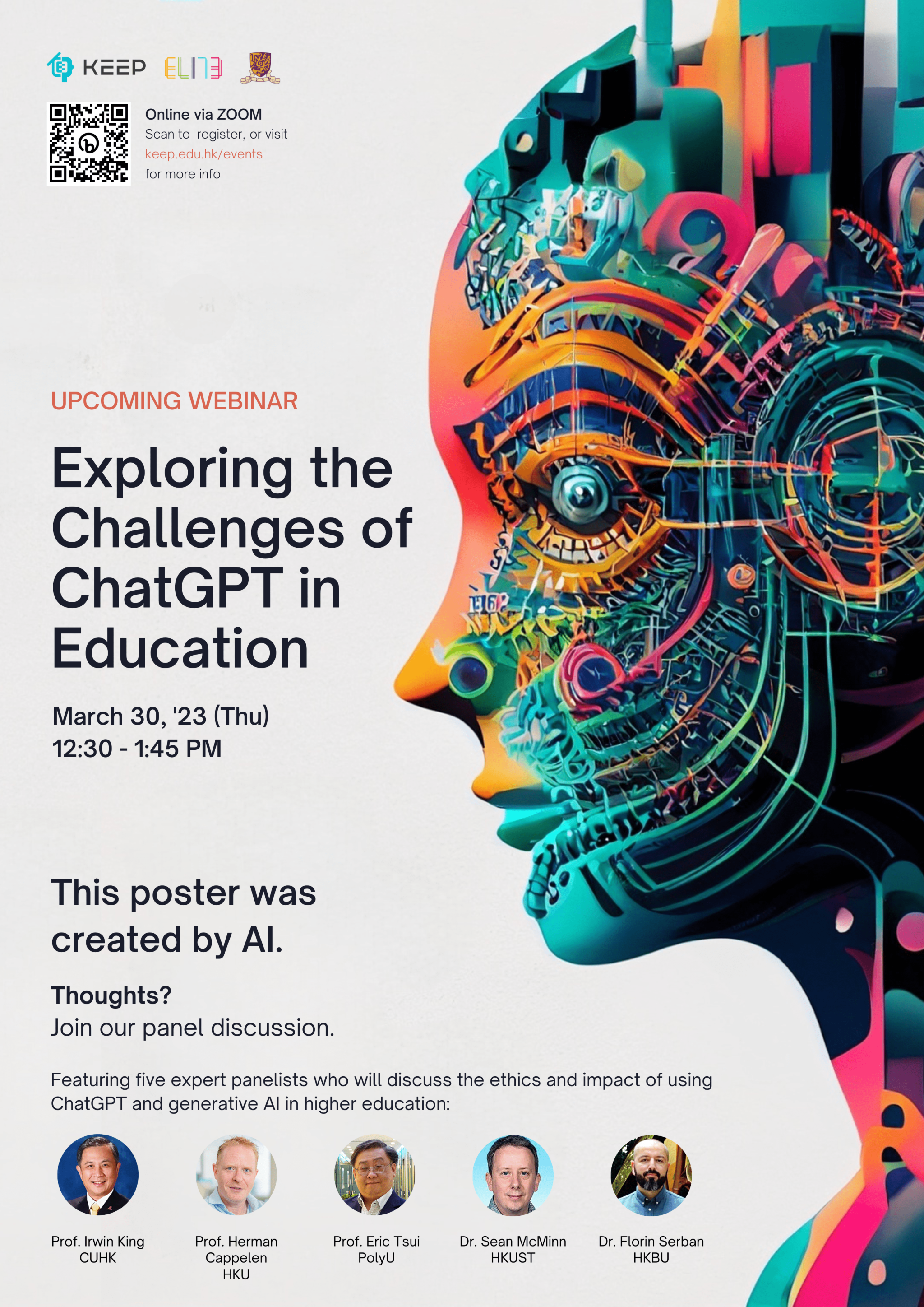 | Exploring the Challenges of ChatGPT in Education Organizer: The Chinese University of Hong Kong Date &Time: March 30 (Thu), 2023, 12:30 pm – 13:45 pm (Hong Kong Time)