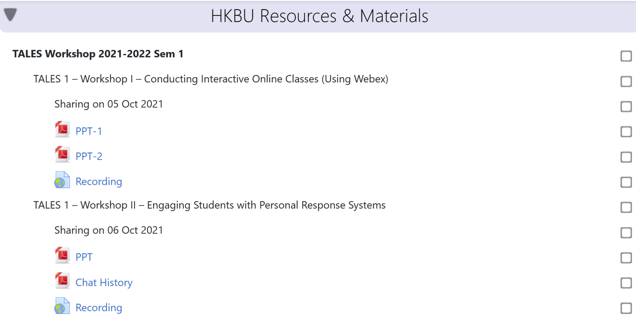 | View HKBU Resources & Materials on iSpace With the generous support of HKBU Centre for Holistic Teaching and Learning, we are pleased to share the recordings and resources of CHTL workshops during the academic year 2022-2023. Go to iSpace "CTL Teaching and Learning Resources" and find the folder "HKBU Resources & Materials".