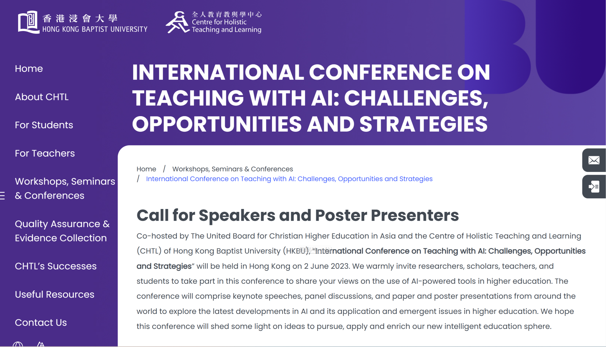 | Call for Speakers and Poster Presenters | International Conference on Teaching with AI: Challenges, Opportunities and Strategies Organizer:The United Board for Christian Higher Education in Asia, the Centre of Holistic Teaching and Learning (CHTL) of Hong Kong Baptist University (HKBU) Date: June 2 (Friday), 2023 Venue:Hong Kong