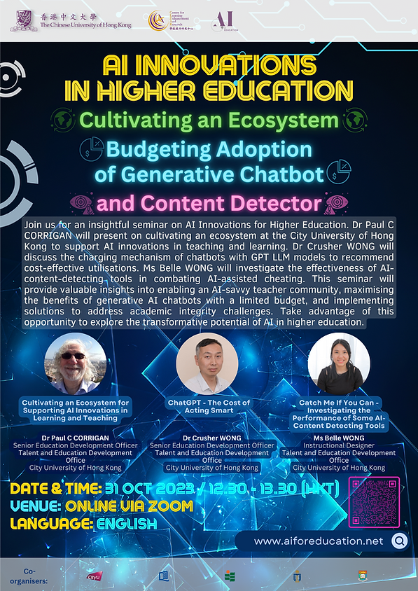 Date & Time: 12:30 - 13:30 (Hong Kong Time), Oct 31 (Tue), 2023 Presenter: Dr. Paul C CORRIGAN (Senior Education Development Officer, Talent and Education Development Office, City University of Hong Kong) Dr. Crusher WONG (Senior Education Development Officer, Talent and Education Development Office, City University of Hong Kong) Ms. Belle WONG (Instructional Designer, Talent and Education Development Office, City University of Hong Kong) Language: English Venue: Online via Zoom Target Audience: All researchers, academics, students, and AI professionals Details and Registration: Click Here