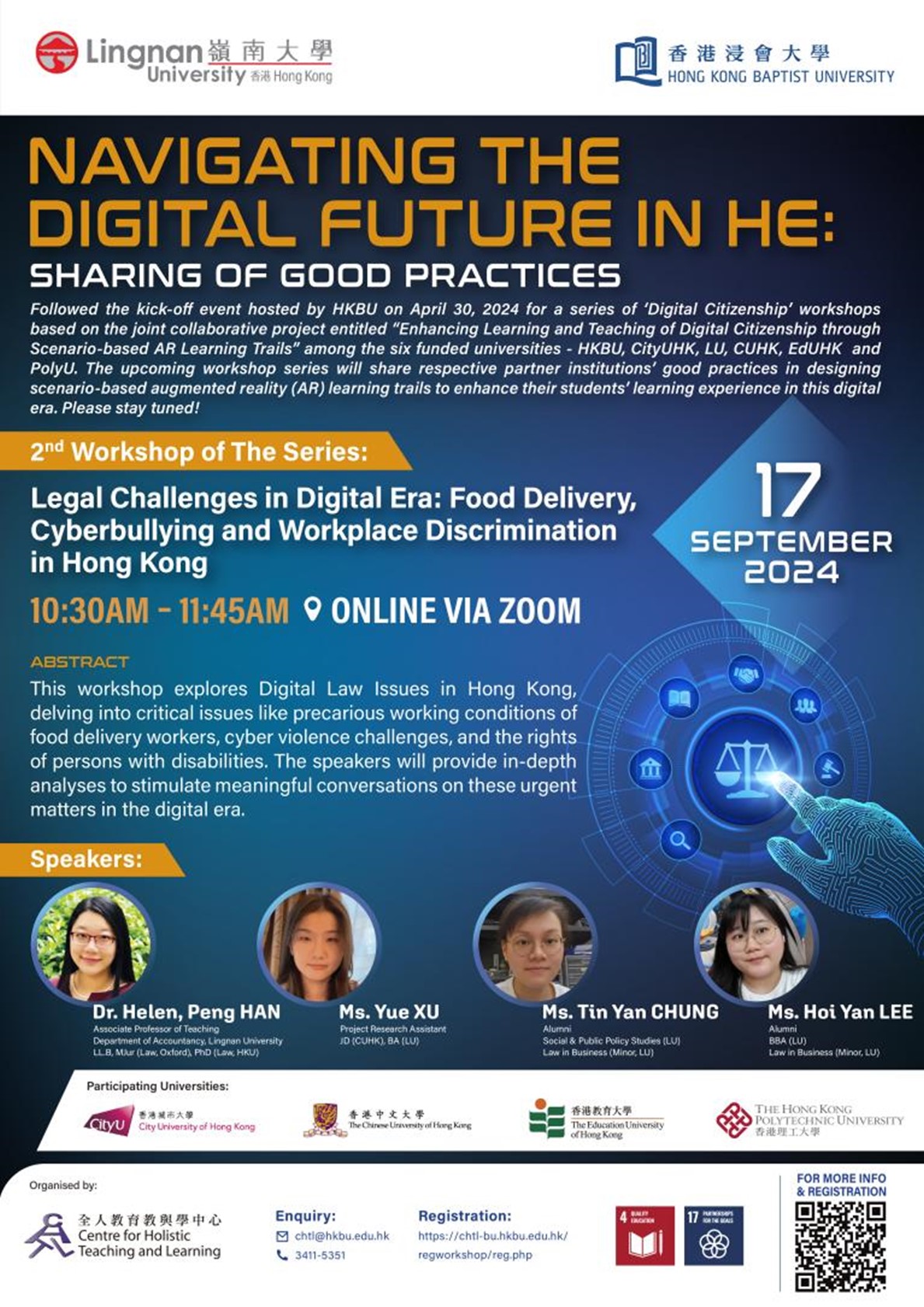 Organizer: HKBU, CUHK, CityU, EdUHKand PolyU Date & Time: 10:30 - 11:45 am, September 17, 2024 (Tuesday) Venue: Online via Zoom Facilitator(s): Dr Helen, Peng HAN, Associate Professor of Teaching, Department of Accountancy, Lingnan University (LL.B, MJur (Law, Oxford), PhD (Law, HKU)); Ms. Yue XU Project Research Assistant, JD (CUHK), BA (LU); Ms. Tin Yan CHUNG (Alumni), Social & Public Policy Studies (LU), Law in Business (Minor, LU); Ms. Hoi Yan LEE(Alumni), BBA (LU), Law in Business (Minor, LU)