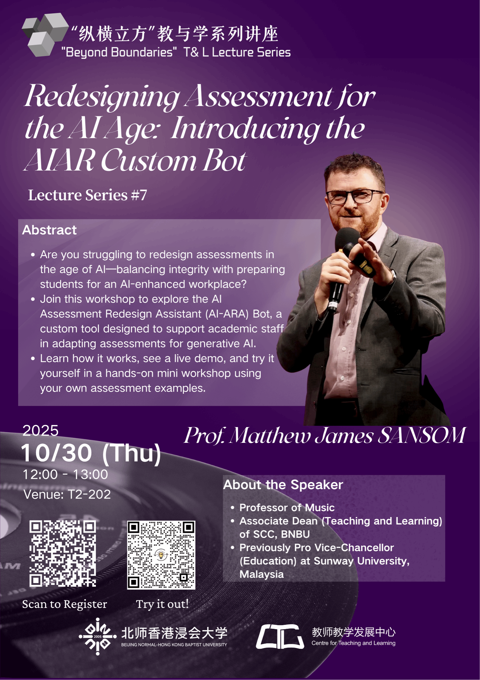 About the Speaker: Matthew Sansom is a Professor of Music at Beijing Normal-Hong Kong Baptist University with over 25 years of academic leadership experience. Previously Pro Vice-Chancellor (Education) at Sunway University, Malaysia, he has held senior positions at multiple universities internationally. Alongside his academic career, he maintains an active artistic practice in sound art, installation, and composition, with commissioned works exhibited and performed globally. He has been actively exploring AI's impact on education since the launch of ChatGPT and is guest editor of the 'AI and Education' special edition of BNBU's Innovative Teaching and Learning Journal expected in 2026.